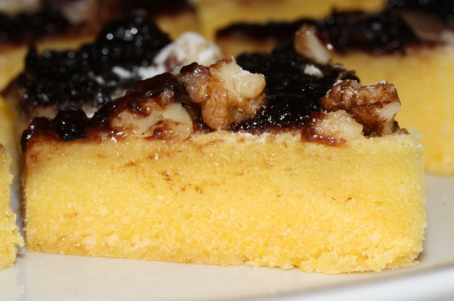 Előmelegített sütőben negyven percig sütjük. Amikor kihűlt kockákra vágjuk, és vaníliás porcukorral megszórjuk a tetejét.