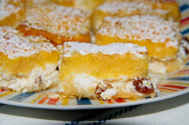 Hozzávalók: 3 dl liszt, 2 dl cukor, csipetnyi só, 13 dkg margarin, 1 vaníliás cukor, 1 sütőpor. Töltelék: 50 dkg túró, 1 (bio) citrom reszelt héja, 3 dl tejföl, 5 evőkanál cukor, 10 dkg vízben áztatott mazsola, 1 vaníliás cukor. A tetejére: 3 tojás, 3 dl tej.