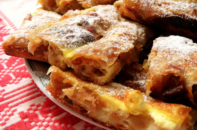 A kétféle lisztet a sóval és a zsírral egy dagasztótálban összemorzsoljuk. Beleütünk három kisebb méretű tojást, rákanalazzuk a tejfölt, és a vízben feloldott citromlével alaposan kidolgozzuk, hogy jól sodorható tésztát kapjunk. Ezt legalább egy órát pihentetjük, de minél tovább áll, annál könnyebb lesz vele dolgozni.