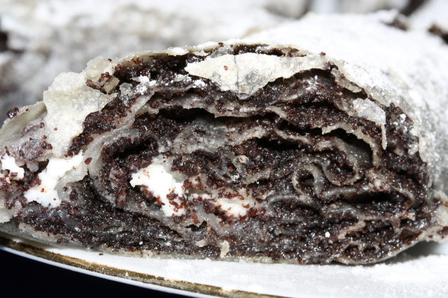 Az abroszt liszttel meghintjük, ezen nyújtjuk szét egyenként a rétestésztákat. A széleit lazán húzogatva, az asztal körül körbe-körbe járva hártyavékonyságúra készítjük. Étolajjal meglocsoljuk, cukros mákkal megszórjuk. Az első levélre tejfölt, a másodikra-harmadikra reszelt almát pötyögtetünk. Szélét leszedjük, és feltekerjük. Olajozott tepsibe helyezzük, tetejét étolajjal átkenjük, és előmelegített sütőben készre sütjük. Szeletelés előtt kicsit hűlni hagyjuk, utána fogyasztható.