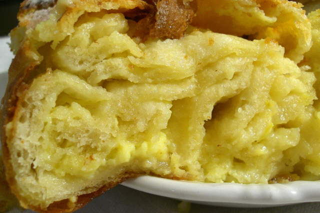 Hozzávalók: A tésztához: 2 marék finomliszt, fél marék rétesliszt, kb. fél liter savó, 5 evőkanál olvasztott sertészsír. A töltelékhez: 1 kg krumpli, só, másfél mokkáskanálnyi őrölt feketebors, 2 tojás, 3 evőkanál tejföl.