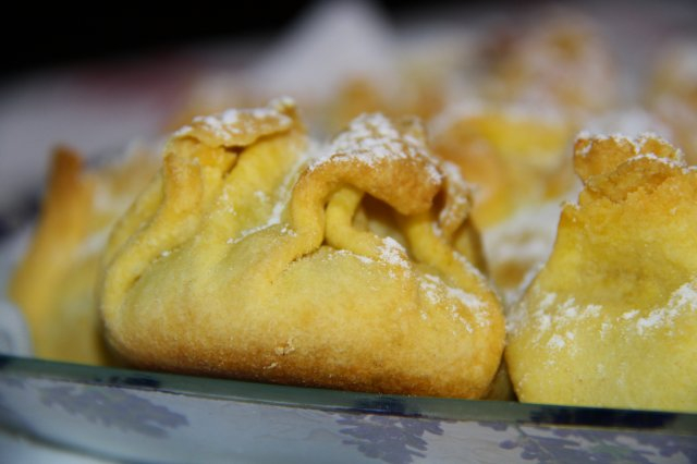 A tészta-gombócokat egyenként vékony, kerek lappá kisodorjuk. Közepükbe egy-egy teáskanálnyi diós tölteléket helyezünk. Széleit összefogjuk, mint egy zsákot.