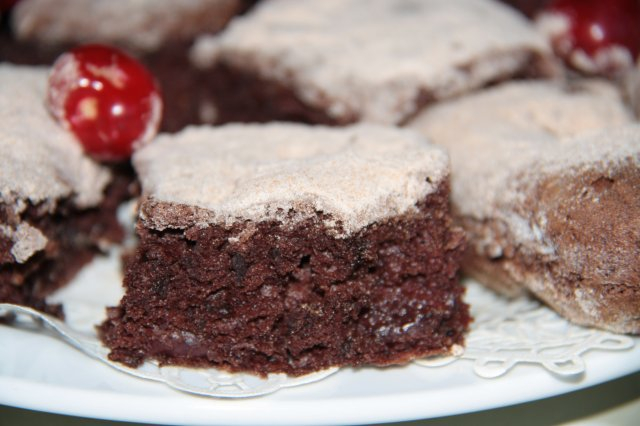 Hozzávalók: 8 tojás, 8 evőkanál cukor, 8 evőkanál liszt, 1 csomag sütőpor, 2 evőkanál kakaópor, 20 dkg magozott meggy, 10 dkg csokoládé. A tepsihez kevés vaj és liszt.
