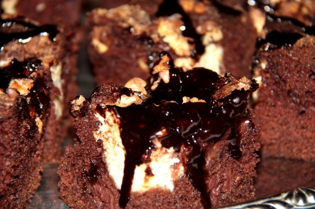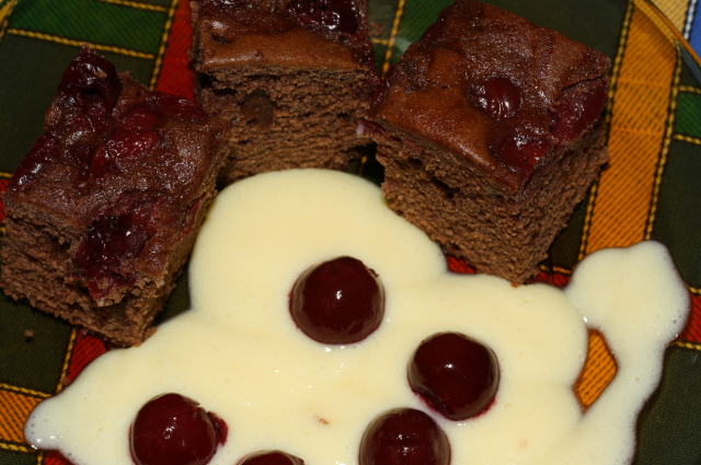 Hozzávalók: 40 dkg liszt, 2 evőkanál kakaó, 2 tojás, 30 dkg porcukor, 1 sütőpor, 1 evőkanál szódabikarbóna, 2 dl étolaj, 3 dl tej. Töltelék: 50 dkg túró, 15 dkg porcukor, 1 evőkanál búzadara, 2 tojás. A tetejére: 30 dkg meggy, 15 dkg vágott dió, 1 teáskanál fahéj, 2 evőkanál kristálycukor. Csoki máz: 2 evőkanál kakaó, 8 evőkanál tej, 3 evőkanál cukor, 5 dkg vaj.