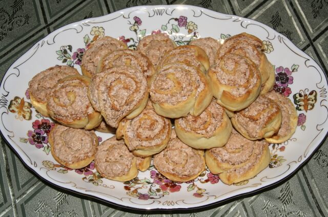 Hozzávalók: 50 dkg liszt, 2 dkg élesztő, 1 teáskanál cukor, 8 evőkanál tej, 20 dkg margarin, 1 tojás, késhegynyi só. Töltelék: 25 dkg darált dió, 20 dkg cukor, 1 vaníliás cukor, 1 citrom reszelt héja, fél dl forró tej. A forgatáshoz porcukor.