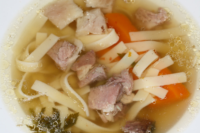A húst bőséges mennyiségű hideg vízben feltesszük főzni. Amikor felforrt, a habját leszedjük, majd megsózzuk. Ezzel együtt addig főzzük, amíg a hús megpuhul, ez kb. másfél óra.