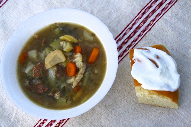 Hozzávalók: 2 kacsa apróléka (zúza, nyak, hát, szív), 1 nagy sárgarépa, 1 nagy petrezselyem, 4 nagy birsalma (vagy két üveg befőtt), 1 evőkanál só, 1 evőkanál liszt, 4 dl tejföl.