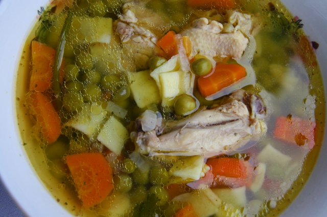 Hozzávalók: (10 főre) 1 nagy petrezselyem gyökér, 4 sárgarépa, 1 vöröshagyma, 1 csokor petrezselyemzöld, 1 kg csirkeaprólék (szárny, comb, láb, mellcsont, szív), só, őrölt bors, 1 evőkanál zsír, 50 dkg zöldborsó. A siflihez: 1 tojás, 15-20 dkg liszt, 1 kávéskanál só.