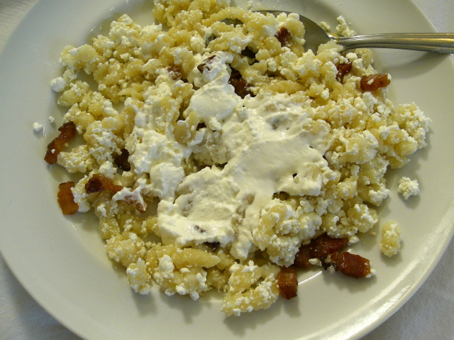 Hozzávalók: 8 db nagy szemű burgonya, 2 fakanálnyi só, kb. 50 dkg finomliszt, 50 dkg rétesliszt, 2,5 deci forró víz, 3 egész tojás, 10 dkg sertészsír, 50 dkg túró, 30 dkg füstölt szalonna, 3 dl tejföl.