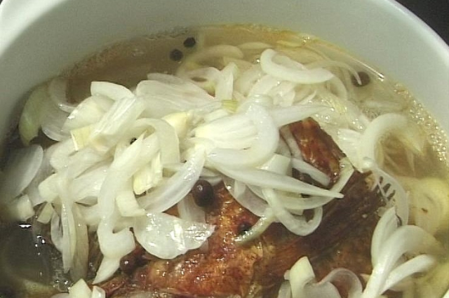 Elsőként a halhoz szükséges különleges pácot kell elkészíteni. Ehhez egy tálban összekeverjük az édes bort, a liquament (ez egy római korból származó fűszer, nehezen beszerezhető, sóval helyettesíthetjük), az étolajat, a lestyánt, a majoránnát, az őrölt borsot, és az apróra vágott mazsolát. További két teáskanál sót szórunk még bele, és megforgatjuk benne a megtisztított, kisebb darabokra vágott halszeleteket. Ebben az illatos fürdőben hagyjuk pihenni legalább két-három órát, de akár előző nap is elkészíthetjük, és felhasználásig hűtőszekrényben tartjuk.