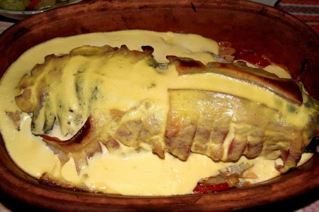 Hozzávalók: másfél kg tisztított amur, 10 dkg füstölt kenyérszalonna, 10 dkg főtt császárszalonna szeletben, 2 nagyobb, és 5 kisebb vöröshagyma. 4 dl tejföl, 1 tojás, 10 dkg margarin, 3 gerezd fokhagyma, 3 evőkanál mustár, őrölt bors, só, 2 paprika, 1 paradicsom, másfél kg krumpli (kompér).