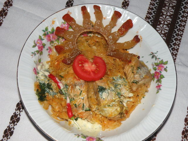 A szalonna zsírjában megpároljuk a vöröshagymát, majd rádobjuk a paprikát és a paradicsomot. Összekeverjük egy teáskanál sóval, és puhára pároljuk. A lecsót őrölt paprikával megszórjuk, és felengedjük 2-3 dl vízzel. Megszórjuk a lecsepegtetett káposzta felével, ráhelyezzük a halszeleteket, majd befedjük a maradék káposztával. Annyi vizet öntünk alá, hogy majdnem ellepje az ételt, megszórjuk kaporral, és 30-40 perc alatt készre főzzük. Tálaláskor tejföllel tesszük az asztalra.