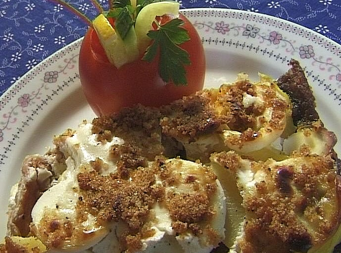 Egy nagyobb tepsit zsírral kikenünk, az alját beborítjuk krumpli szeletekkel, meglocsoljuk tejföllel, ráhelyezzük a pontyot, majd betakarjuk krumplival. Kicsit megsózzuk, újra meglocsoljuk tejföllel, tojáskarikákat teszünk a tetejére. A maradék tejfölt még ráöntjük, és megszórjuk pirított zsemlemorzsával. Előmelegített sütőben készre sütjük.