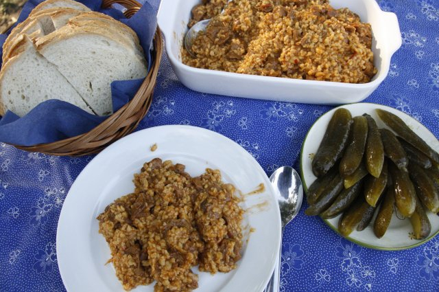 Hozzávalók: 50 dkg rizs, 80 dkg vegyes kacsahús (szárny, comb), 1 vöröshagyma, 4 sárgarépa, 4 petrezselyem, fél karalábé, 1 evőkanál sertészsír, 1 teáskanál őrölt paprika, 1 teáskanál só, 1 teáskanál őrölt feketebors.