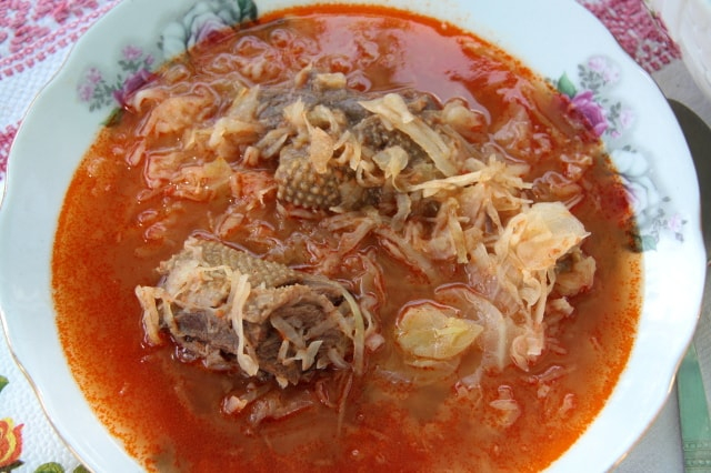 Hozzávalók: (15 főre) 1 egész kacsa megtisztítva – feldarabolva, 4 evőkanál só, 3 fej káposzta, 2 fakanál sertészsír, 6 evőkanál liszt, 1 nagyobb fej vöröshagyma, 1 evőkanál őrölt paprika, 2 liter paradicsomlé, 5 babérlevél, 1 evőkanál őrölt feketebors.