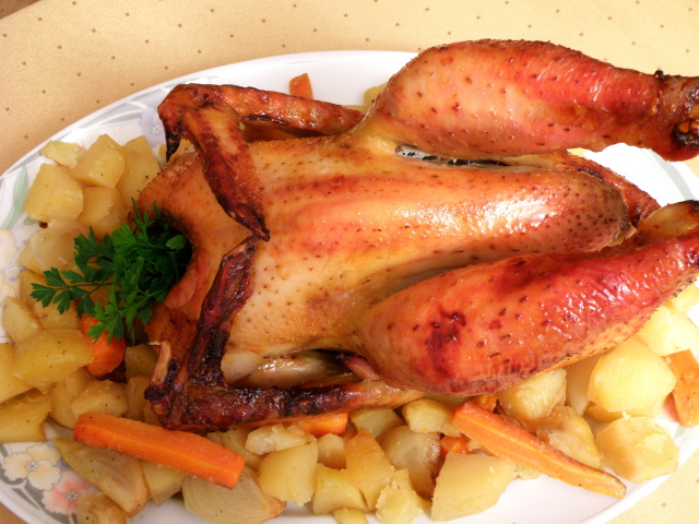 Egy nagyobb hőálló edényt étolajjal kikenünk, az aljába öntjük a burgonyát, sárgarépát és hagymát. Sóval, borssal megszórjuk. A csirke lábait összekötözzük, sóval, borssal kívül-belül alaposan bedörzsöljük, és a zöldségágyra helyezzük. Alufóliával letakarva, sütőben a csirke nagyságától függően egy-másfél órán át pároljuk. Félidőben a csirkét megfordítjuk, és újra visszatoljuk. Amikor megpuhult az étel, a mustárt a mézzel összekeverjük, és bekenjük vele a csirkét. További 20 percig (fólia nélkül) sütjük, amikor szép piros, lehet fogyasztani.