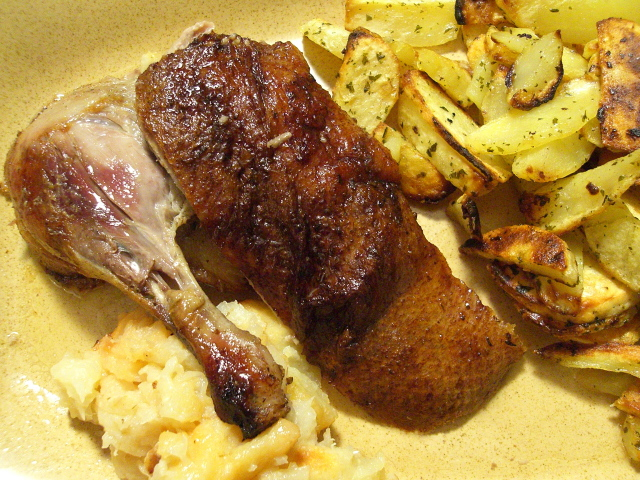 A cserépedény aljába beletesszük a rozmaringágat. A kacsát kívül-belül besózzuk, testüregét a megtisztított birsalmával megtöltjük, és a tálba helyezzük. Betoljuk az előfűtött kemencébe. 40 percnyi sütés után kivesszük, kisült zsírját leöntjük, és meglocsoljuk vele a kacsa bőrét. Ezt a műveletet még a sütés közben kétszer megismételjük, úgy 10-15 percenként.