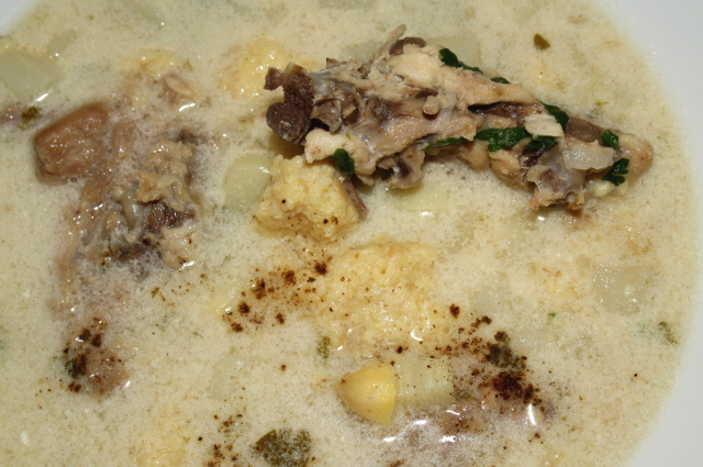 Rántást készítünk. Kevés étolajban lepirítjuk a lisztet, majd a tűzről félrehúzva beletesszük a zúzott fokhagymát és apránként felöntjük egy deci hideg vízzel. Összeforraljuk, és ezzel sűrítjük a levesünket. Tálalás előtt egy evőkanál ecettel savanyítjuk.
