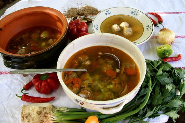 Hozzávalók: 1 sárgarépa, 1 petrezselyemgyökér, fél zellergumó, fél paprika, kis csokor zeller zöld, 2 babérlevél, 1 teáskanál őrölt paprika, só, 1 fél vöröshagyma, 2 gerezd fokhagyma, 1 evőkanál őrölt paprika, 1 teáskanál őrölt feketebors, 5 szem egészbors, 1 evőkanál sertészsír, 5 dkg szárított vargánya. A gombóchoz: 2,5 dl hajdina, 10 dkg füstölt szalonna, 1 fél vöröshagyma, 2 gerezd fokhagyma, 1 csokor petrezselyemzöld, 1 tojás, 1 kávéskanál őrölt bors, 1 teáskanál só, 10 dkg hajdinaliszt.