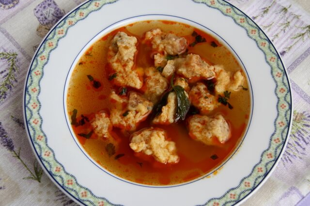 Hozzávalók: 1 kisebb fej vöröshagyma, 1 fakanál sertészsír, só, 1 sárgarépa, 1 petrezselyem gyökér, 1 burgonya, 2 kávéskanál őrölt feketebors, 2 csapott evőkanál őrölt paprika, 1 gerezd fokhagyma, 1 csokor petrezselyemzöld. A betéthez: 2 tojás, fél dl víz, 1 teáskanál só, 5 evőkanál liszt, kevés zsír, 2 zsemle, vagy kenyér.