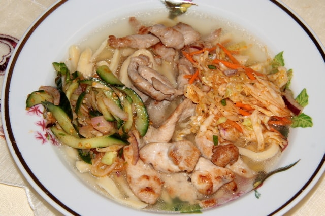 Hozzávalók: 2 csirke far-hát, 1 csirkemell filé, 30 dkg sovány sertéshús, 1 kávéskanál őrölt feketebors, 1 teáskanál őrölt fűszerpaprika, 1 kávéskanál ecet, 5 dkg pirított szezámmag, kis csokornyi koriander, 1 sárgarépa, 3 gerezd fokhagyma, 1 lila hagyma, 1 vöröshagyma, 1 kis fej káposzta, 1 kígyóuborka, 2 evőkanál szójaszósz, só, 6 evőkanál étolaj. A tésztához: 25 dkg liszt, 2 tojás, 1 teáskanál só, 1 evőkanál étolaj.