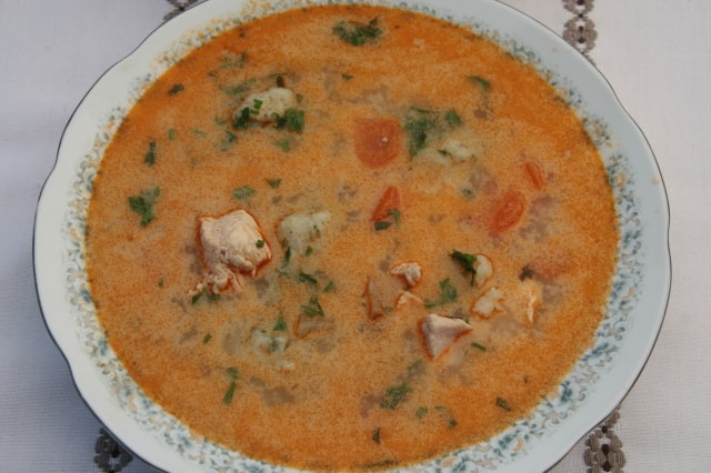 Hozzávalók: (10 főre) 1,5 kg húsos sertéscsont, 2 vöröshagyma, 1,5 kg csirkemell, 40 dkg vegyes zöldség (sárgarépa, petrezselyem, karalábé, zeller), 15 dkg zöldborsó, 10 dkg gomba, 20 dkg karfiol, só, bors, 1 citrom leve. A gombóchoz: 70 dkg krumpli, 1 csokor petrezselyemzöld, 3 tojás, 20 dkg liszt, 1 kávéskanál őrölt feketebors, 2 teáskanál só, 2 gerezd fokhagyma, 1 kisebb vöröshagyma. A rántáshoz: 1 evőkanál sertészsír, 2 evőkanál liszt, 2 teáskanál őrölt paprika. A habaráshoz: 3 dl tejszín, 2 tojás sárgája, csipetnyi só.