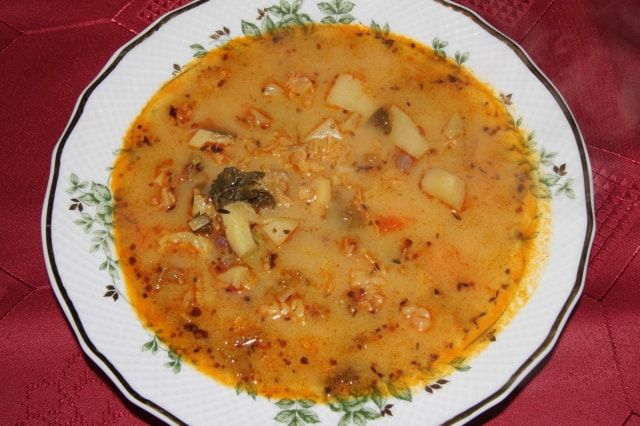 Hozzávalók: 1 közepes fej (kb. 40 dkg) kelkáposzta, 30 dkg füstölt sonka, 6 db közepes nagyságú krumpli, 2 sárgarépa, 2 petrezselyem, 3 lila hagyma, 7 gerezd fokhagyma, 2 zöldpaprika, 1 csokor petrezselyemzöld, fél dl étolaj, 4 evőkanál liszt, 2 dl tejföl. A fűszerezéshez: só, 3 kávéskanál őrölt fűszerpaprika, 2 kávéskanál őrölt kömény és kurkuma, 4 kávéskanál majoránna és kakukkfű, kevés őrölt feketebors, 3 teáskanál őrölt gyömbér, 3 evőkanál házi készítésű ketchup (vagy egy paradicsom).