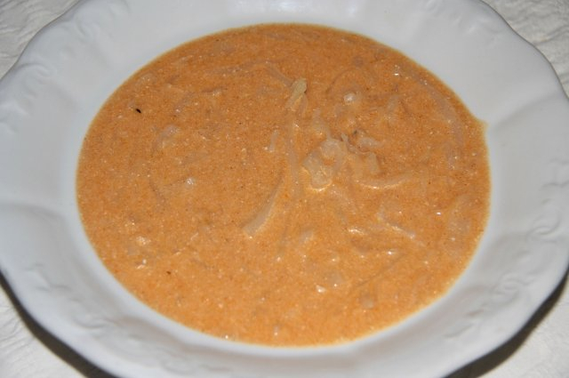 Tálalás előtt forró levessel átmelegített tejföllel, és házi készítésű ketchuppel összeforraljuk. Ez utóbbi helyett tehetünk az ételbe egy szem paradicsomot, azzal is nagyon finom.