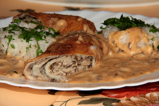 Egyenként megtöltjük, a következőképpen: a palacsinta közepére téglalap alakban szétterítjük a gombás tölteléket, két oldalát felhajtjuk, majd hosszában feltekerjük. Ezt a hurkaformát a szokásos módon bepanírozzuk.