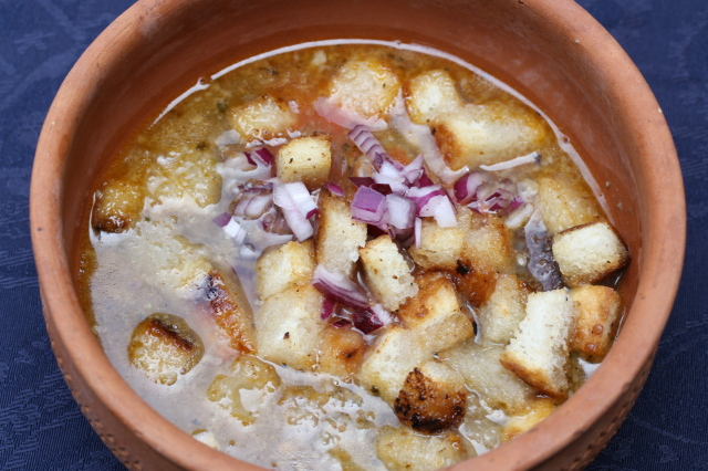 Mindenki a saját tányérjába ízlés szerint tehet a levesbe paradicsomlevet, hagymakockát, és zsemlekockát.