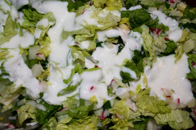 Közben a salátához való többi zöldséget is előkészítjük. A saláta leveleit kisebb darabokra tépjük, a kaprot és petrezselyem zöldjét felaprítjuk, a zöldhagymát kisebb karikákra vágjuk. A retket tökgyalun belereszeljük. Összekeverjük az előfőzött spárgával.