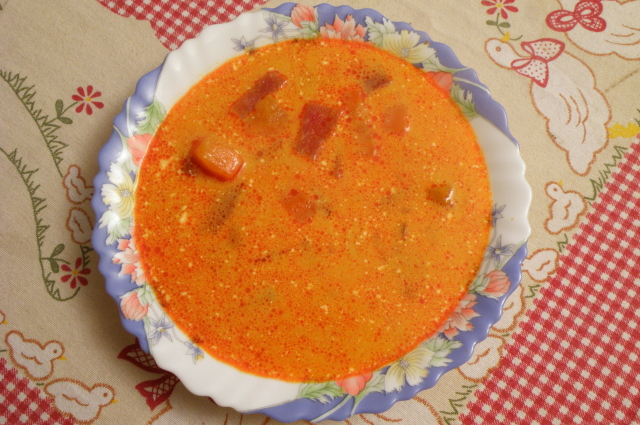 A fűszertartót és az egész fokhagymákat kiszedjük a levesből. A habarást néhány merőkanálnyi forró lével átmelegítjük, majd a fazékba öntjük. Felforraljuk, és a fokhagymás paprikával tovább ízesítjük.