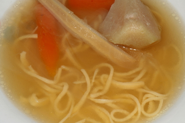A nyelveket megtisztítjuk, átmossuk, felöntjük 3 liter vízzel. Az egész borsot és az összetört babérlevelet fűszertartóba tesszük, úgy dobjuk a levesbe. Négy gerezd fokhagymát megtisztítunk, és azt is hozzáadjuk. Sóval ízesítjük, és fedő alatt egy órán át főzzük.
