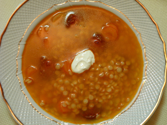 Hozzávalók: 1 kg burgonya, 3 sárgarépa, 1 petrezselyem gyökér, 25 dkg füstölt kolbász, 20 dkg tarhonya, 1 teáskanál őrölt paprika, 1 evőkanál liszt, fél dl étolaj, só.