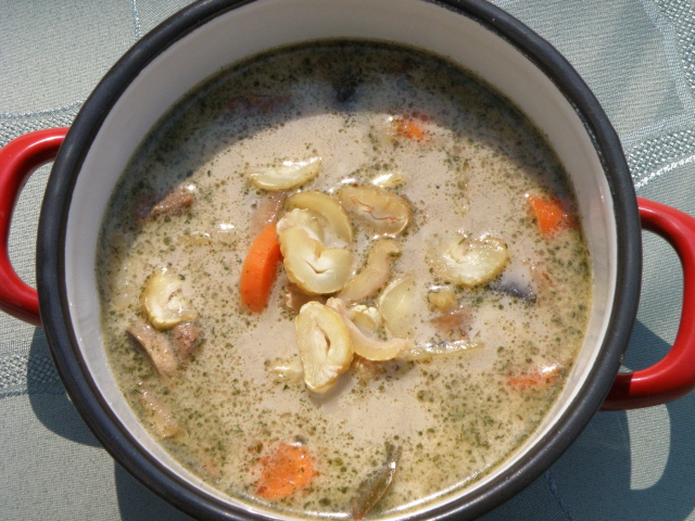 A levesből kiveszünk egy lábosba 3-4 merőkanálnyit, beleöntünk 3 dl tejszínt, és az egészet visszaborítjuk a bográcsba. Keverünk még hozzá ízesítésként áfonyalekvárt, összeforraljuk, ha szükséges, ízesítjük még sóval, kaporral. A tetejére vágott gesztenyét teszünk, ez lesz a leves betétje.