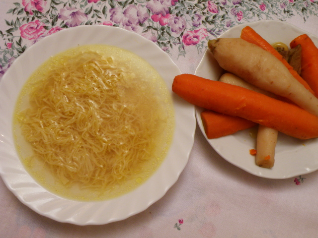 A tyúkhúslevest a cérnametélttel, és a levesből kiszedett zöldségekkel együtt tesszük az asztalra.