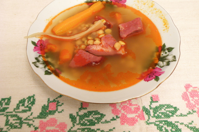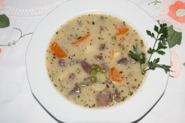 A gondosan megtisztított tyúkot félbevágjuk, ha nagyon zsíros, akkor abból leszedünk. A belsőségekkel együtt nagyobb fazékba tesszük, felöntjük annyi vízzel, hogy ellepje, és felforraljuk. Leszedjük a habját, és hozzáadjuk a megtisztított, és kisebb darabokra vágott zöldségeket: a petrezselyem gyökeret, sárgarépát, csípős paprikát, a meghámozott paradicsomokat, a zellergumót, a kelbimbót, cseresznyepaprikát. Fűszerezzük borssal, köménnyel, sóval, és fedő nélkül, lassú tűzön hosszú ideig főzögetjük. Félidőben átfordítjuk a húsokat, és beletesszük a zöldeket, a vöröshagymát és fokhagymát, valamint a szerecsendiót.