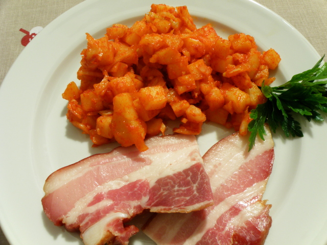 Hozzávalók: 1 kg krumpli, 1 kis fej vöröshagyma, só, 2 teáskanál őrölt pirospaprika, 2 evőkanál étolaj, vagy tökmagolaj. Az öntethez: 1 evőkanál cukor, 1 csapott evőkanál ecet, csipetnyi só.