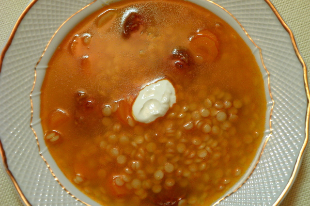 Ízlés szerint sózzuk, őrölt borssal megszórjuk, és beletesszük a petrezselyem-és zeller zöldjét. Amikor a krumpli megpuhult, az öreg lebbencsünk is elkészült.