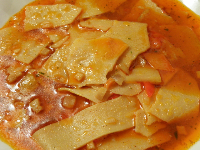 Hozzávalók: A tésztához: 30 dkg liszt, 3 tojás. A leveshez: 30 dkg krumpli, 20 dkg vöröshagyma, 2 paprika, 2 paradicsom, 30 dkg szalonna, 2 evőkanál őrölt fűszerpaprika, 1 teáskanál őrölt bors, só, 1 csokor petrezselyem- és zeller zöldje, 40 dkg lebbencs tészta.