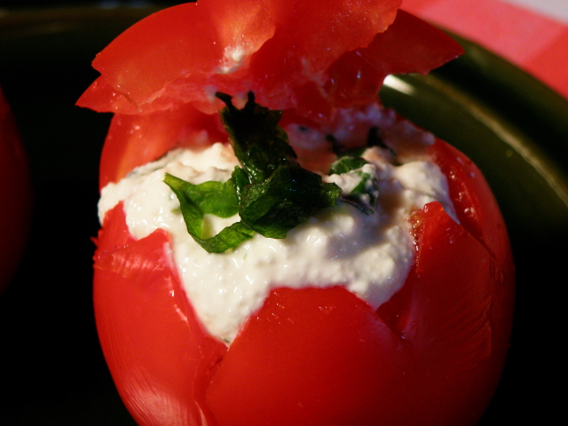 A túrót a tejföllel összekeverjük, sózzuk, és hozzáadjuk az összevágott medvehagyma levelet. Kanállal megtöltjük a paradicsomok üregét, és kicsit félrecsapva visszatesszük mindegyikre a kalapokat.