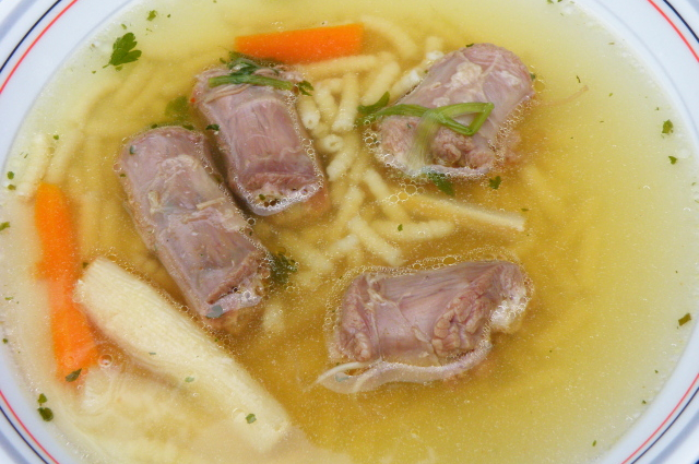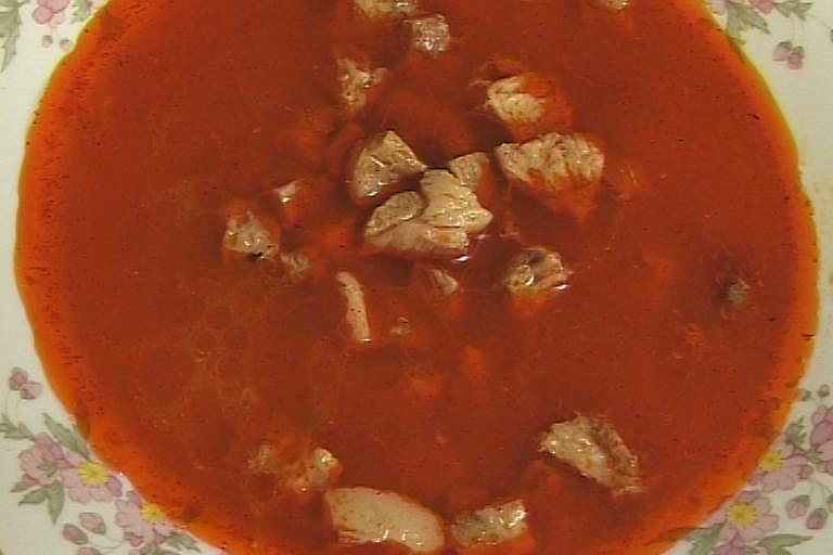 Két órán át főzzük, hogy a hús teljesen megpuhuljon. A habját nem szükséges leszedni. Ezután a paprikát és a hagymákat kiszedjük, és világos rántást készítünk. A zsíron a lisztet megpirítjuk, a tűzről félrehúzva őrölt paprikát keverünk hozzá, és felengedjük hideg vízzel. Összeforraljuk, és a levesbe öntjük.