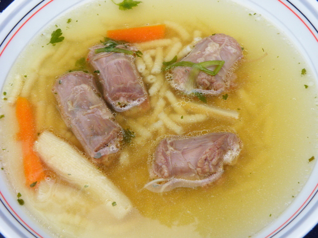 Miközben a libanyak puhul, elkészíthetjük a levestésztát. Egy nagyobb tálban az egész tojásokat felverjük, és összegyúrjuk a liszttel. Jól kidolgozzuk, majd vékonyra kisodorjuk. Felkockázzuk, és lúdgége készítővel egyenként felpödörjük. Közben a többi tésztát nedves konyharuhával, vagy nylonnal letakarva tartjuk, nehogy kiszáradjon.