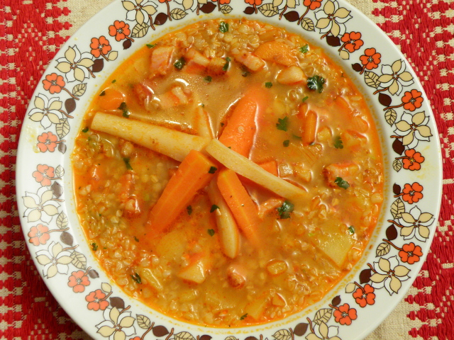 Hozzávalók: 10 dkg füstölt szalonna, 2 fej vöröshagyma, 1 nagyobb szál petrezselyem gyökere, 2 sárgarépa, 15 dkg hajdinakása, 1 teáskanál őrölt fűszerpaprika, 2 közepes nagyságú burgonya, 1 teáskanál só, kis csokornyi petrezselyem zöldje.