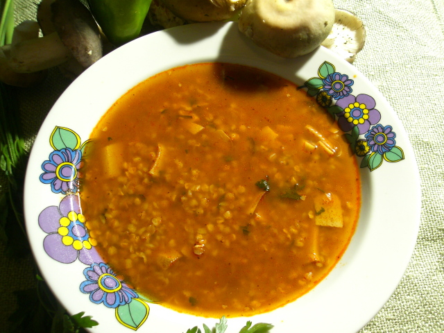 Hozzávalók: 1 sárgarépa, 1 vöröshagyma, 1 gerezd fokhagyma, 1 paprika, 1 csokor petrezselyem zöldje. Egy deciliternyi hajdina, 1 babérlevél, só, őrölt feketebors, majoránna, bazsalikom. 2 evőkanál zsír, 6 evőkanál liszt, 2 evőkanál fűszerpaprika. 10 dkg vargánya.