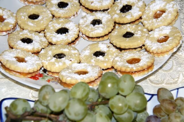 Ezt lisztezett gyúrótáblán is átdolgozzuk, majd vékonyra kinyújtjuk. Kétféle szaggatót használunk hozzá. Az egyik közepén legyen egy kör alakú lyuk, hogy a töltésnél a szilvalekvár lásson a sütemény közepében.