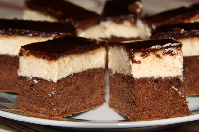 Hozzávalók: 4 tojás, 4 evőkanál porcukor, 6 evőkanál liszt, 2 evőkanál kakaó, fél csomag sütőpor, 1 dl víz, 3 evőkanál kristálycukor. A tepsibe 1 evőkanál zsír, 1 evőkanál liszt. A krémhez: 25 dkg margarin, 20 dkg porcukor, 25 dkg cukor nélküli gesztenyemassza, 2 evőkanál rum. A csoki mázhoz: 20 dkg porcukor, 1 púpos evőkanál kakaó, 4 evőkanál víz, 1 evőkanál étolaj.