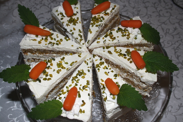 Hozzávalók: 30 dkg sárgarépa, 3 tojás, csipetnyi só, 15 dkg kristálycukor, 25 dkg őrölt dió, 10 dkg finomliszt, 1 sütőpor. A krémhez: 20 dkg natúr krémsajt, 4 evőkanál kristálycukor, fél liter habtejszín, 1 csomag habfixáló. A tortaforma kikenéséhez vaj. A díszítéshez pisztácia, főtt sárgarépa, citromfű.