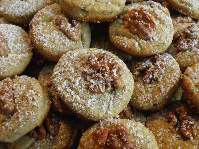 Hozzávalók: 30 dkg liszt, 15 dkg sertészsír, 15 dkg darált dió, 15 dkg porcukor, fél csomag sütőpor, 1 tojás sárgája, 3-4 evőkanál tejföl (vagy tej), 1 csomag vaníliás cukor. A tepsi kikenéséhez sertészsír, a pogácsák tetejére fél diószemek, és porcukor.