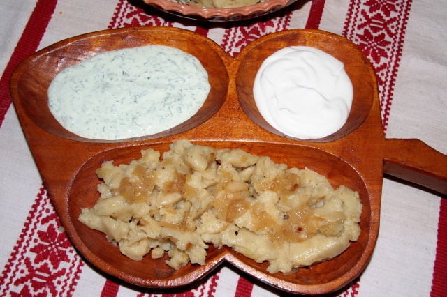 Hozzávalók: (10 főre) 3 kg krumpli, 1 kg vöröshagyma, 10 dkg sertészsír, 6 teáskanál só, 1,5 kg liszt, 4 evőkanál vargánya por. A tetejére: 2 dl tejföl, 10 dkg medvehagyma.